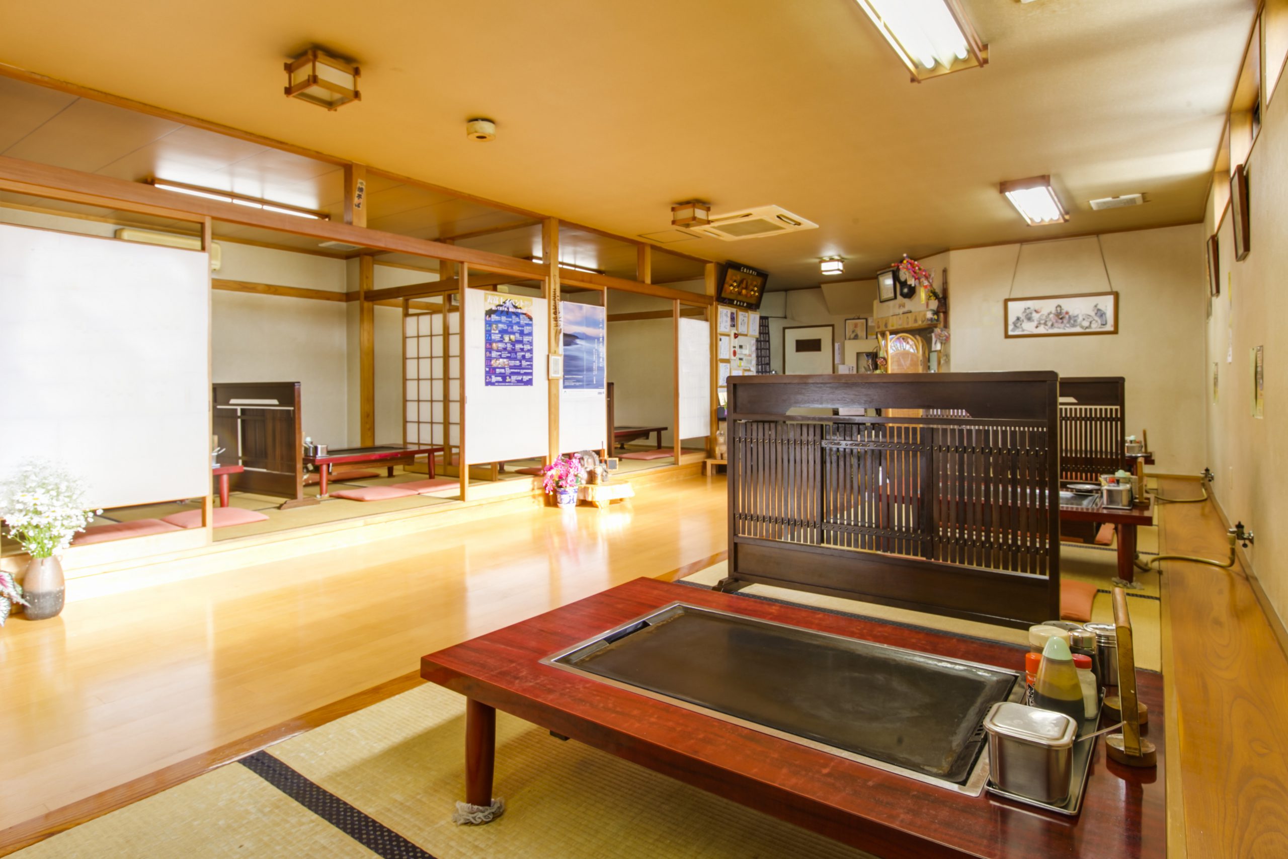 10卓のテーブルすべてに鉄板が付いており、収容人数は約40名。