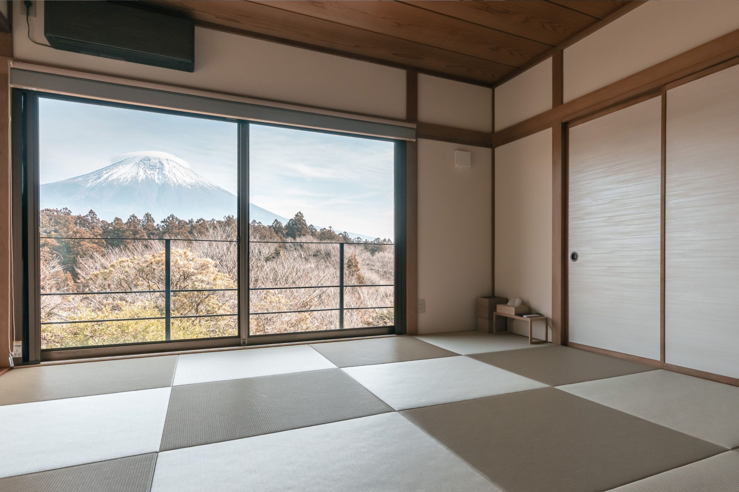 静寂と高級感が調和する空間で、特注の大きな窓から望む富士山の絶景や囲炉裏を囲むひとときが魅力です。
