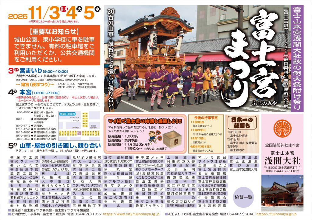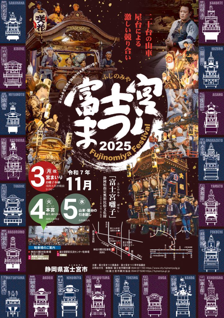 イベント情報 富士宮まつり -秋宮- 11月3日(月)~5日(水)の3日間、富士山本宮浅間大社秋の例大祭 富士宮まつり-秋宮- が開催されます。 富士宮市役所ホームページ内 富士宮まつり-秋宮-ページ へ 富士宮まつり 公式サイト へ カレンダーに戻る